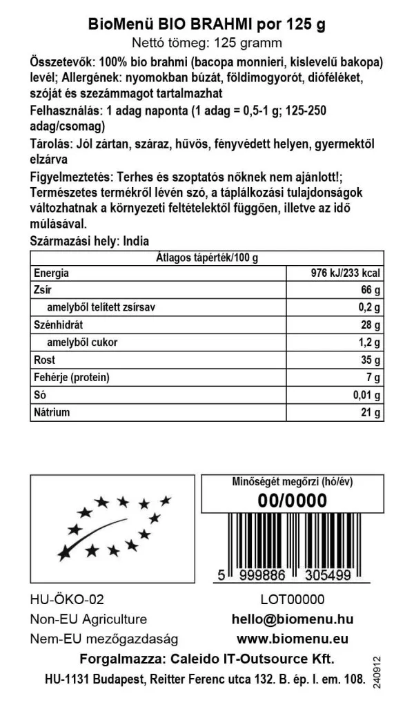 100% bio list Brahmi (bacopa monnieri, bacopa malolistá). Může obsahovat stopy pšenice, arašídů, ořechů, sóji a sezamu.
